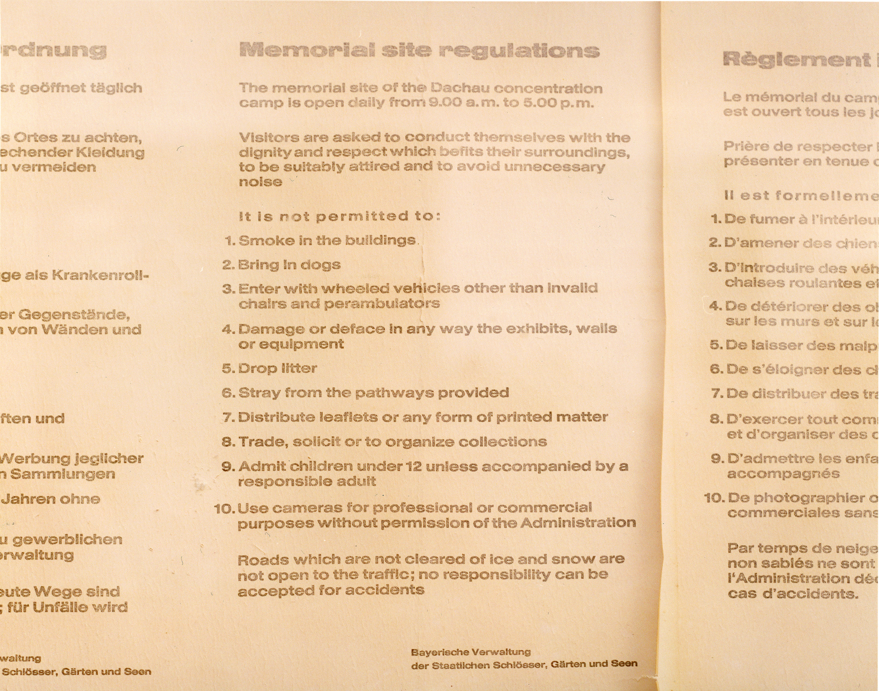 The concentration camp at Dachau was the first of its kind and served as a prototype for subsequent ones. It was opened in 1933 and is located near Munich. Although Dachau is often referred to as a work camp, it was a death camp insofar as labor and starvation rations were a form of extermination. In addition, the famous gas chamber disguised as a shower room was completed in 1942 and is currently labeled as having not been in use for the three years before liberation, even though, according to many sources, it was in fact used. In 1945 the camp was liberated by the US army and later the Dachau war crimes trials were held there. Refugees and displaced persons lived in the prisoners’ barracks, some for as long as 18 years until the memorial site at Dachau was consecrated.