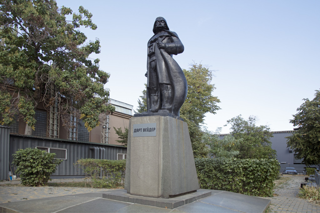 In 2015, twenty four years after the dissolution of the Soviet Union, Ukraine instituted a “De-communization Act”. Two Lenin statues survived this law, one in Chernobyl could not be removed until 2022, and a last one remains in an IT park on the outskirts of Odessa, encased in a black polyester resin rendering of Darth Vader by Oleksandr Milov. Outlines of Lenin’s wide lapels, long “Lenin coat,” and baggy pants are present in the form of Darth Vader including a rolled up Communist Manifesto in the figure’s right hand, now a collapsed lightsaber.