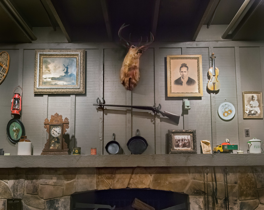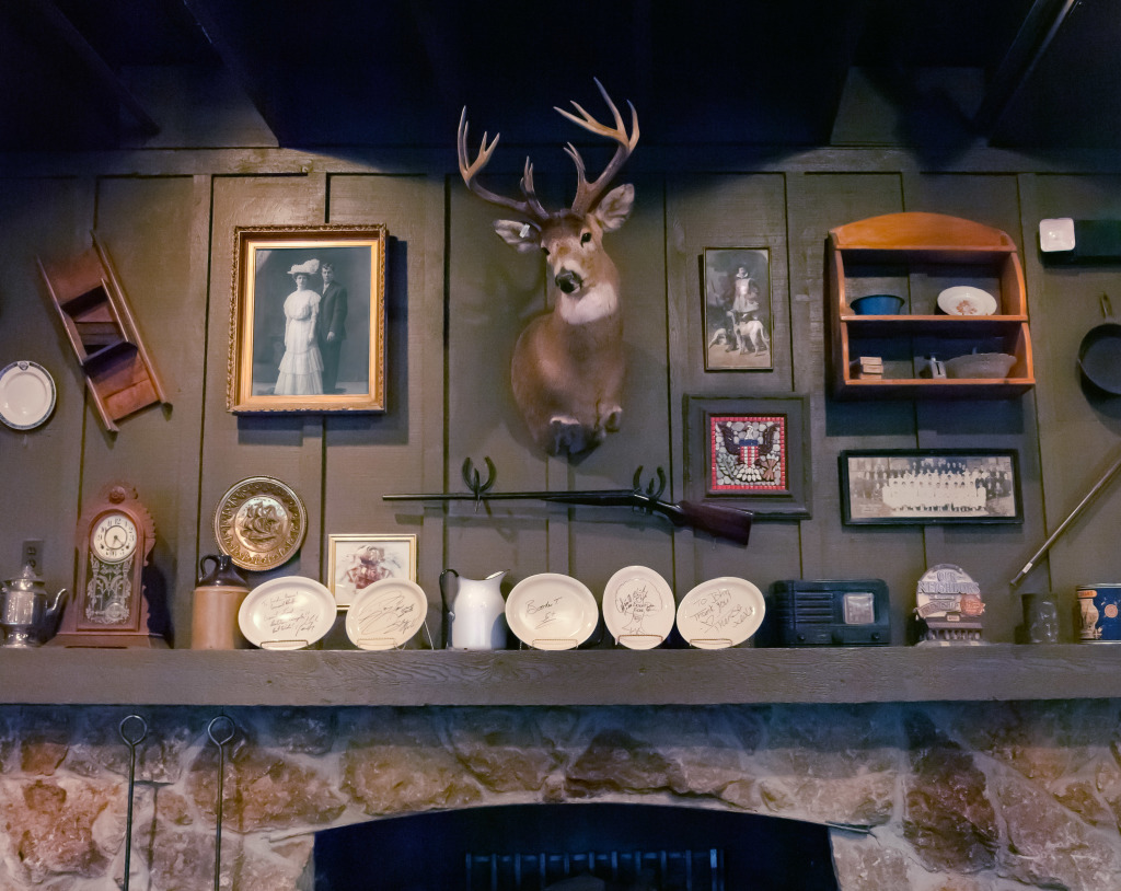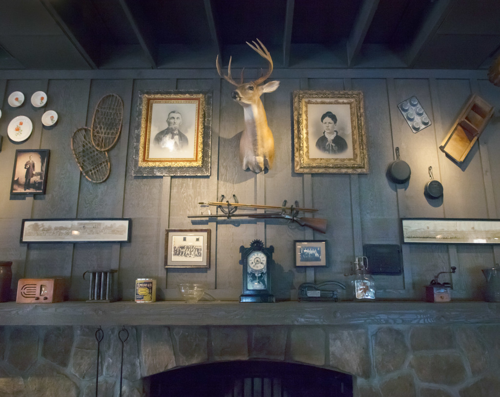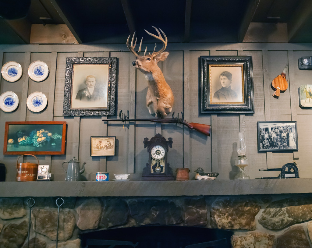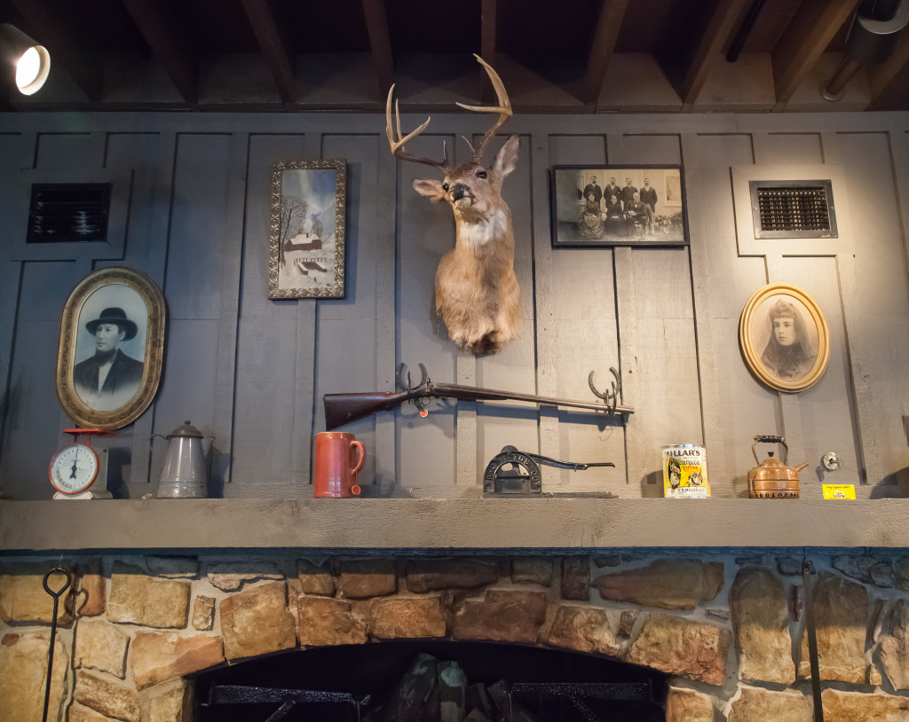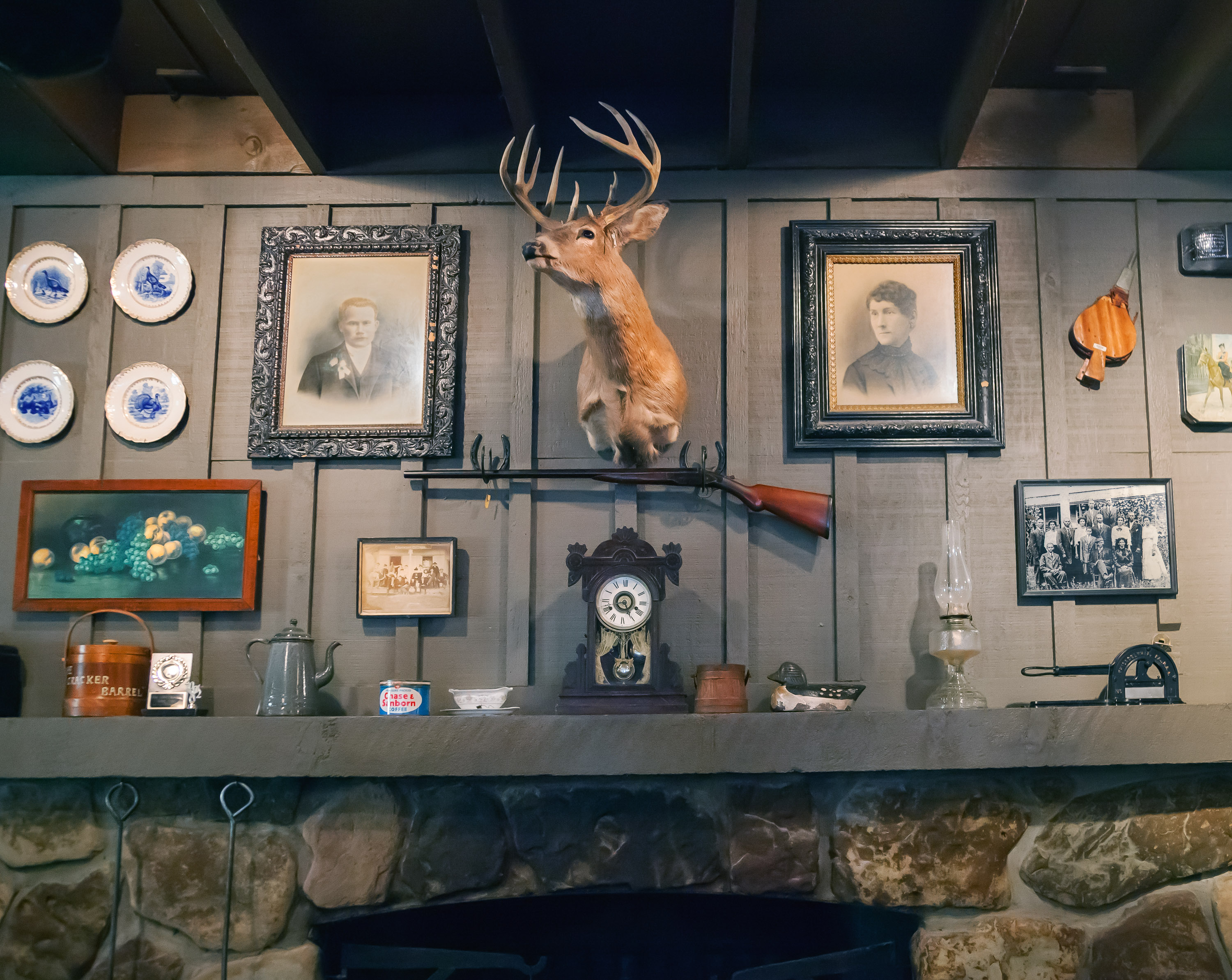 To ensure a reliable product, the menu as well as the restaurant’s physical appearance were standardized so every Cracker Barrel feels eerily familiar. They share the same layout: a gift store by the entrance that funnels guests to a greeter station which is the entrance to the dining room. The whole interior is decorated with carefully selected authentic American antiques. The highlight is the functioning fireplace with mantelpiece, above which is always an old fashioned rifle and deer head. Emanating from these two objects, with less regularity, are photographic or painted family and group portraits, landscape paintings, maybe a radio, a fan, snow shoes and other objects that one might have found in a rural general store. All the objects come from a stocked warehouse located at the company’s 90 acre compound in Lebanon, Tennessee which houses over 90,000 artifacts. Designers physically arrange the antiques on walls inside mock restaurants that are then photographed before being dismantled and sent to each new location for installation.