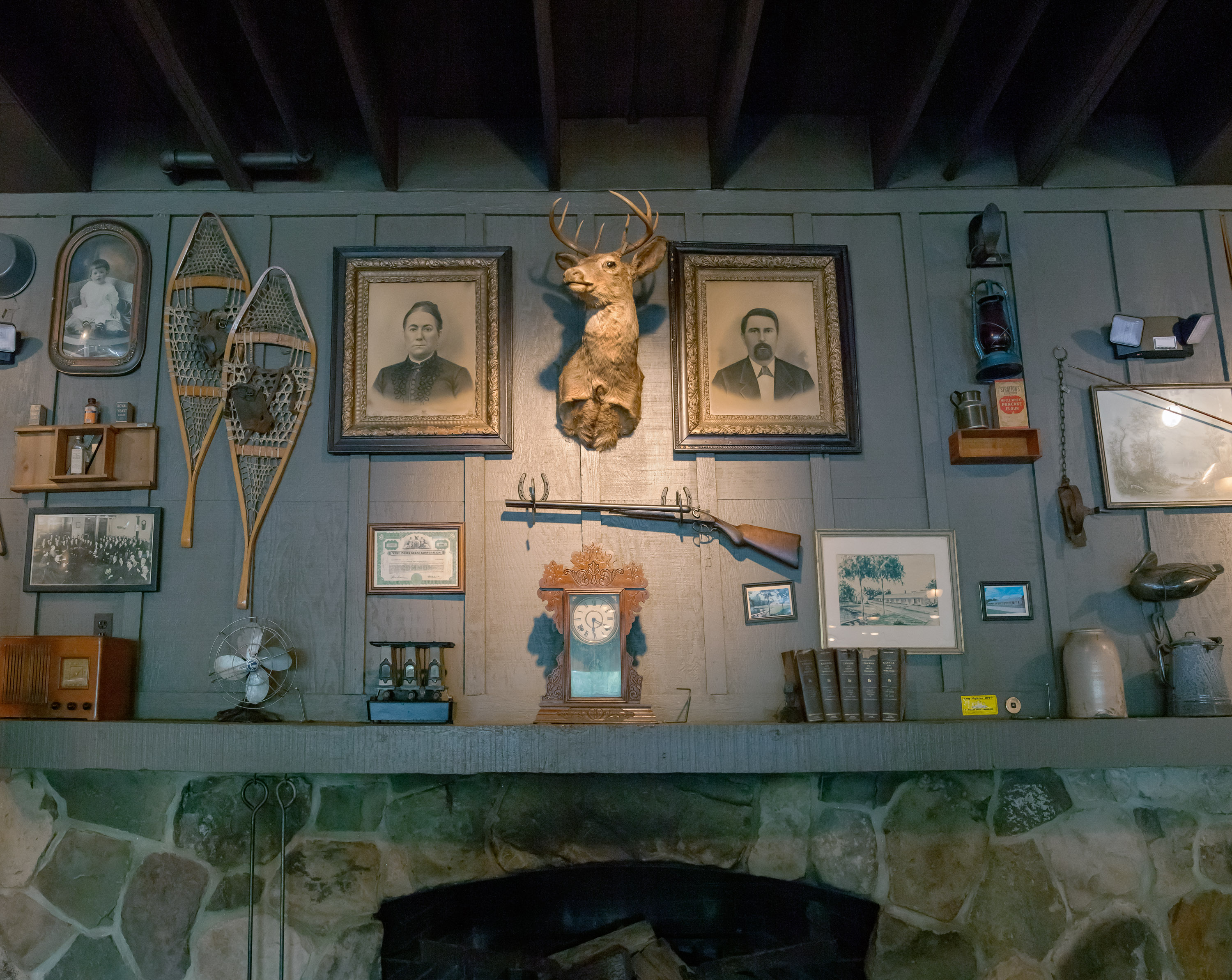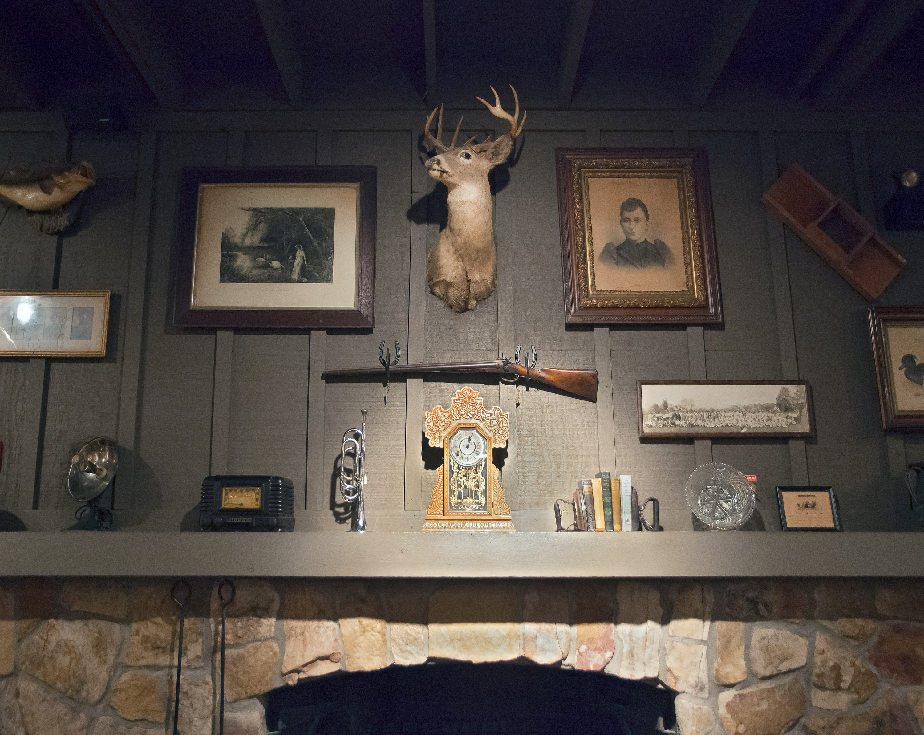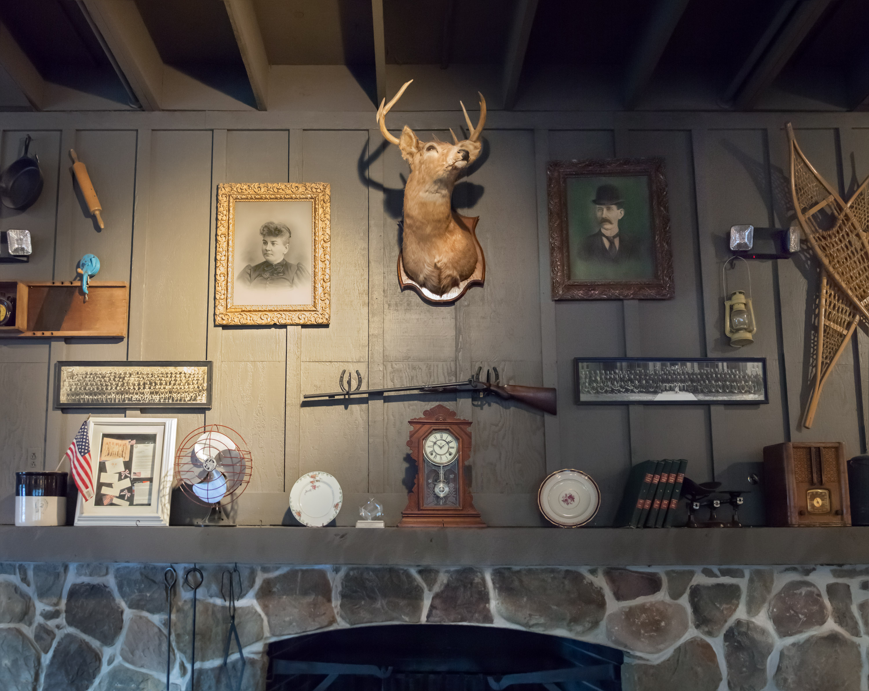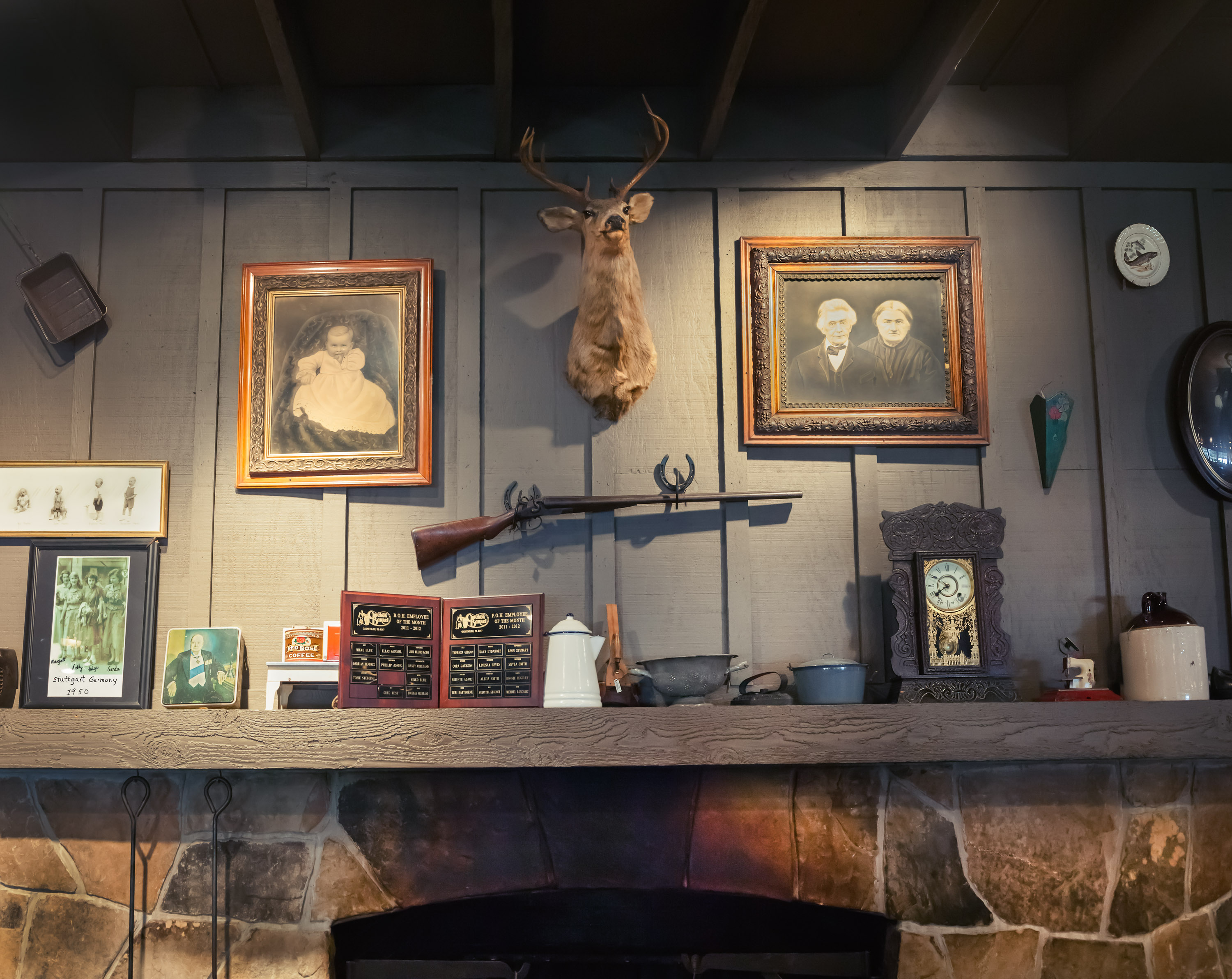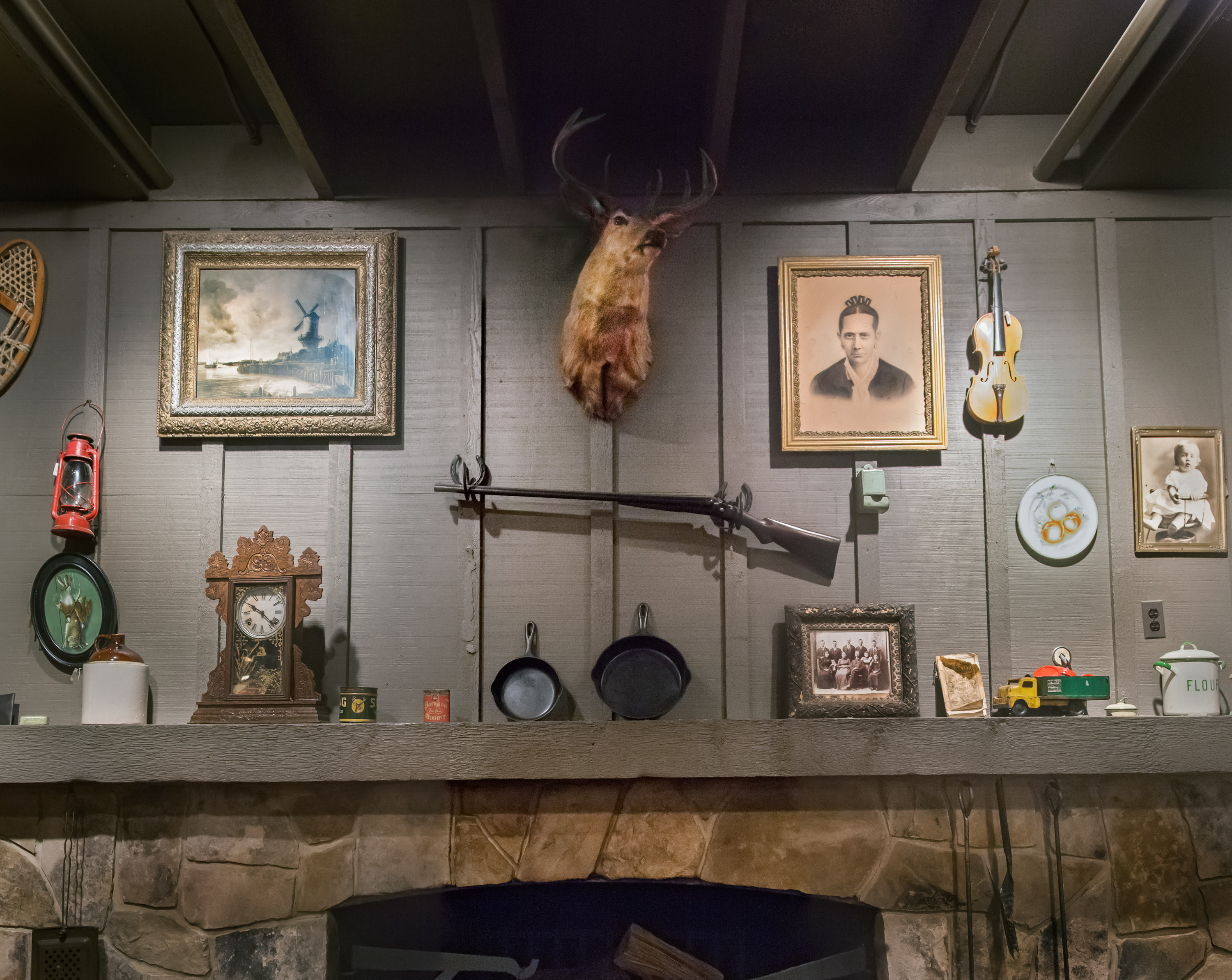 To ensure a reliable product, the menu as well as the restaurant’s physical appearance were standardized so every Cracker Barrel feels eerily familiar. They share the same layout: a gift store by the entrance that funnels guests to a greeter station which is the entrance to the dining room. The whole interior is decorated with carefully selected authentic American antiques. The highlight is the functioning fireplace with mantelpiece, above which is always an old fashioned rifle and deer head. Emanating from these two objects, with less regularity, are photographic or painted family and group portraits, landscape paintings, maybe a radio, a fan, snow shoes and other objects that one might have found in a rural general store. All the objects come from a stocked warehouse located at the company’s 90 acre compound in Lebanon, Tennessee which houses over 90,000 artifacts. Designers physically arrange the antiques on walls inside mock restaurants that are then photographed before being dismantled and sent to each new location for installation.