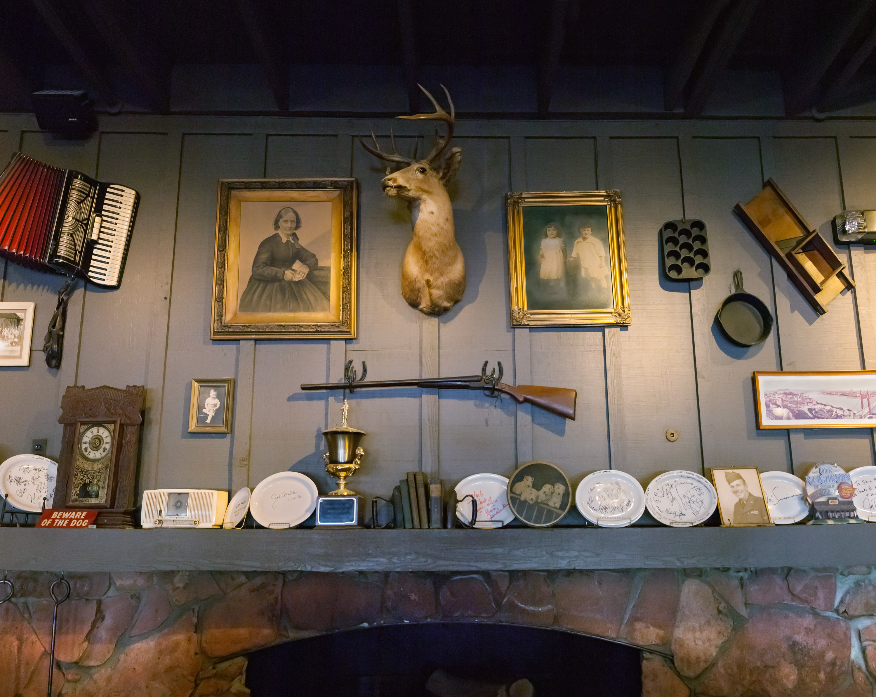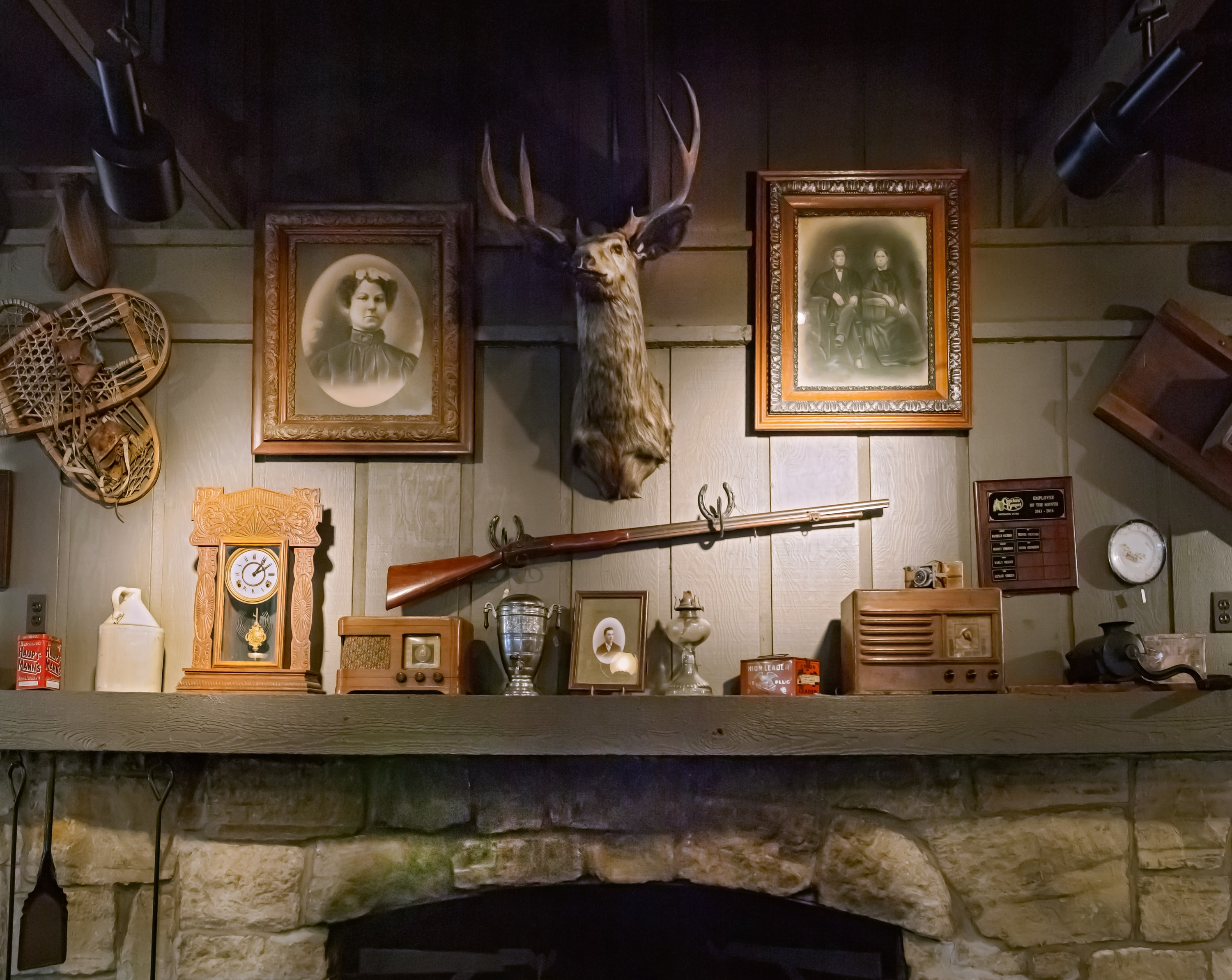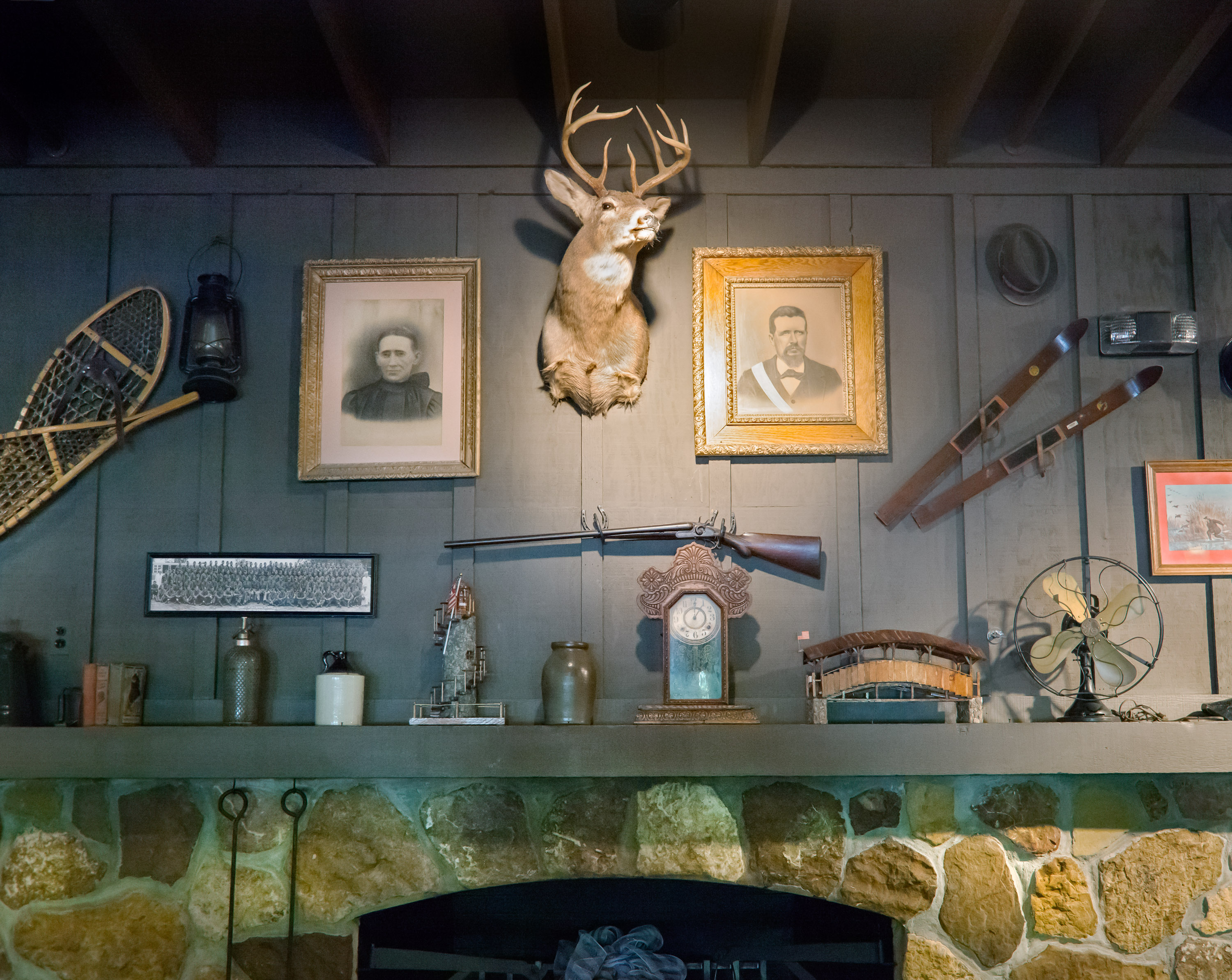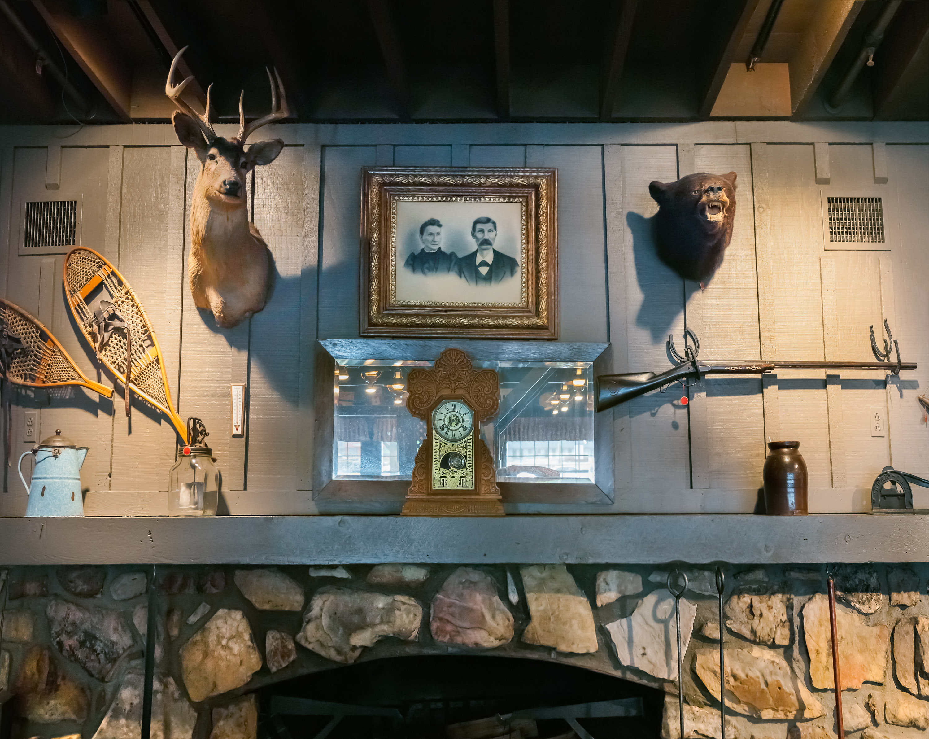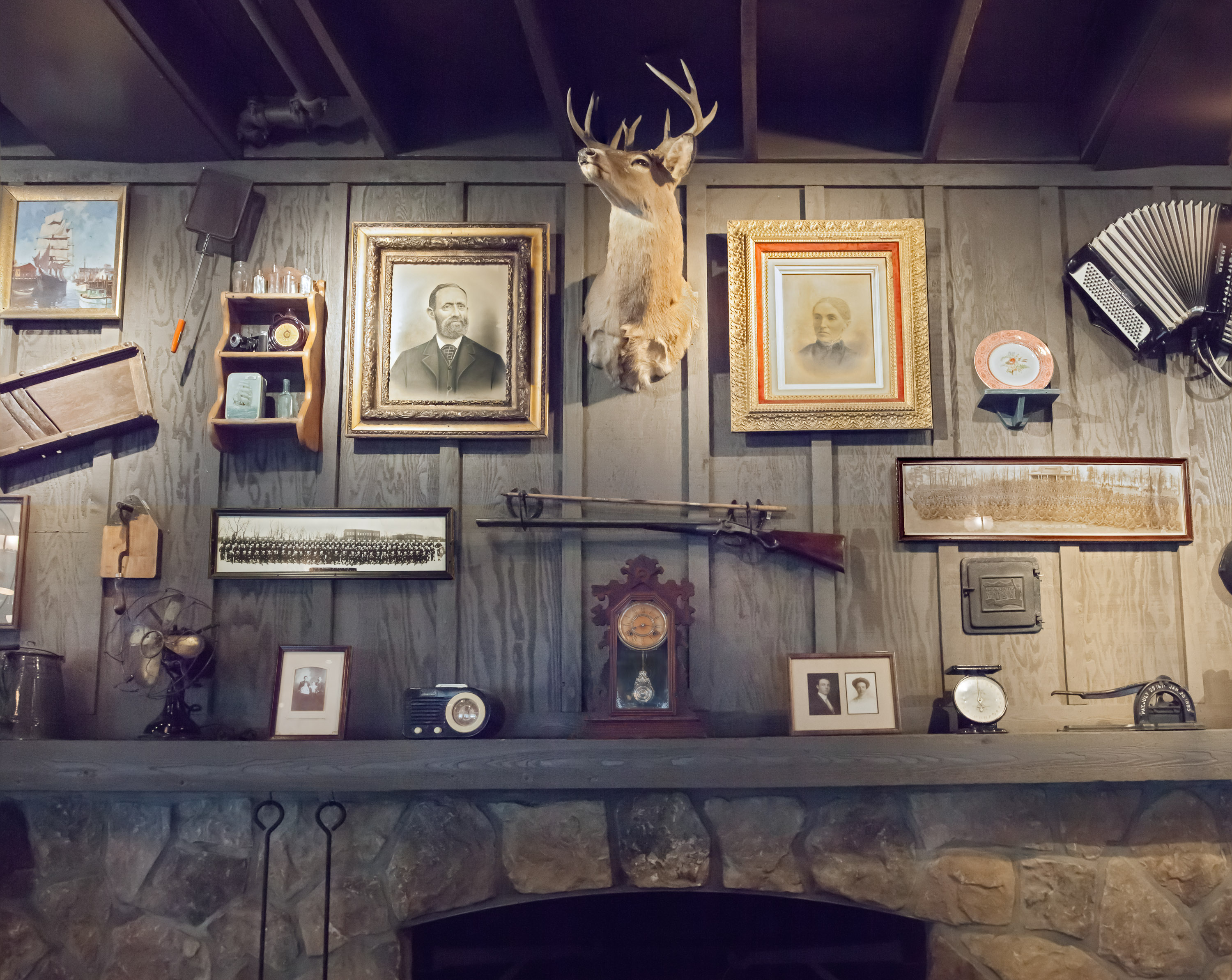 To ensure a reliable product, the menu as well as the restaurant’s physical appearance were standardized so every Cracker Barrel feels eerily familiar. They share the same layout: a gift store by the entrance that funnels guests to a greeter station which is the entrance to the dining room. The whole interior is decorated with carefully selected authentic American antiques. The highlight is the functioning fireplace with mantelpiece, above which is always an old fashioned rifle and deer head. Emanating from these two objects, with less regularity, are photographic or painted family and group portraits, landscape paintings, maybe a radio, a fan, snow shoes and other objects that one might have found in a rural general store. All the objects come from a stocked warehouse located at the company’s 90 acre compound in Lebanon, Tennessee which houses over 90,000 artifacts. Designers physically arrange the antiques on walls inside mock restaurants that are then photographed before being dismantled and sent to each new location for installation.